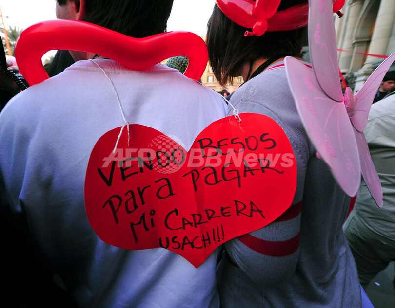 写真は、「サンティアゴ大学の学費を稼ぐためにキスを売ります」と書かれた紙を背に「キス・パーティー」に参加する学生(2011年7月6日撮影)。(c)AFP/Martin Bernetti