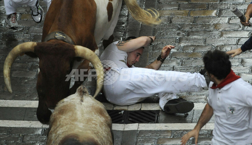 写真は、牛に追われて転倒する男性(2011年7月10日撮影)。(c)AFP/ANDER GILLENEA