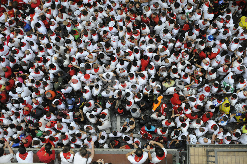 写真は、牛追い祭りで開門を待つ人々(2011年7月10日撮影)。(c)AFP/ANDER GILLENEA