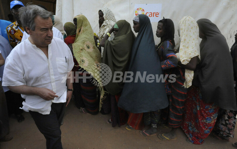 写真は、ダダーブ難民キャンプを視察する国連難民高等弁務官事務所(UNHCR)のアントニオ・グテーレス(Antonio Guterres)高等弁務官(左、2011年7月10日撮影)。(c)AFP/SIMON MAINA