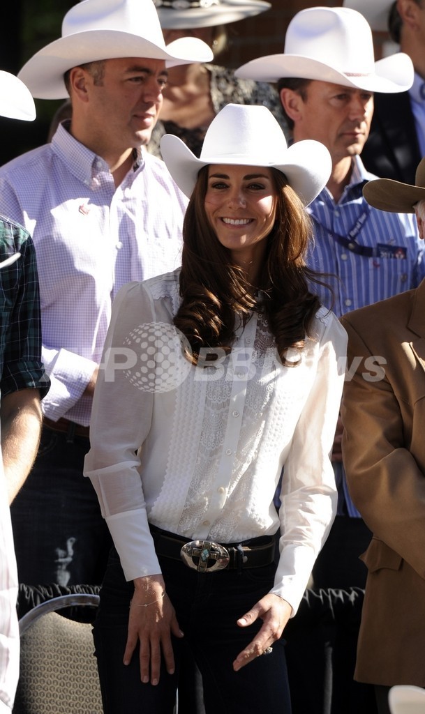 アルバータ(Alberta)で8日に開かれたカウボーイの祭典「カルガリー・スタンピード(Calgary Stampede)」には、真っ白なカウボーイハットをかぶって出席。カルガリー(Calgary)動物園で開かれたレセプションでは「キャサリン・ウォーカー(Catherine Walker)」の真っ赤なコートとドレスを着用し、カナダのシンボルであるメープルリーフをかたどったダイヤモンドのブローチをコーディネートした。