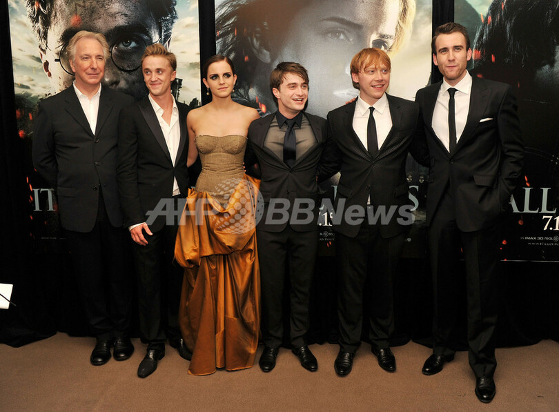 映画「ハリー・ポッター(Harry Potter)」シリーズ最終作『ハリー・ポッターと死の秘宝PART2(Harry Potter and the Deathly Hallows -- Part 2)』のプレミア上映会が11日、米ニューヨーク(New York)で開催され、出演者たちが登場した。写真は、レッドカーペットに登場した(左から)アラン・リックマン(Alan Rickman)、トム・フェルトン(Tom Felton)、エマ・ワトソン(Emma Watson)、ダニエル・ラドクリフ(Daniel Radcliffe)、ルパート・グリント(Rupert Grint)、マシュー・ルイス(Matthew Lewis、2011年7月11日撮影)。(c)AFP/Getty Images/Stephen Lovekin