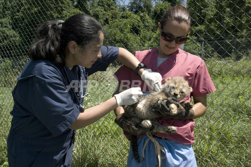 撮影日は前日12日で、赤ちゃんチーターたちはこの日、初めて健康診断を受けた。スミソニアン保全生物学研究所は、米ワシントンD.C.(Washington D.C.)のスミソニアン国立動物園(Smithsonian National Zoo)の研究施設。(c)AFP