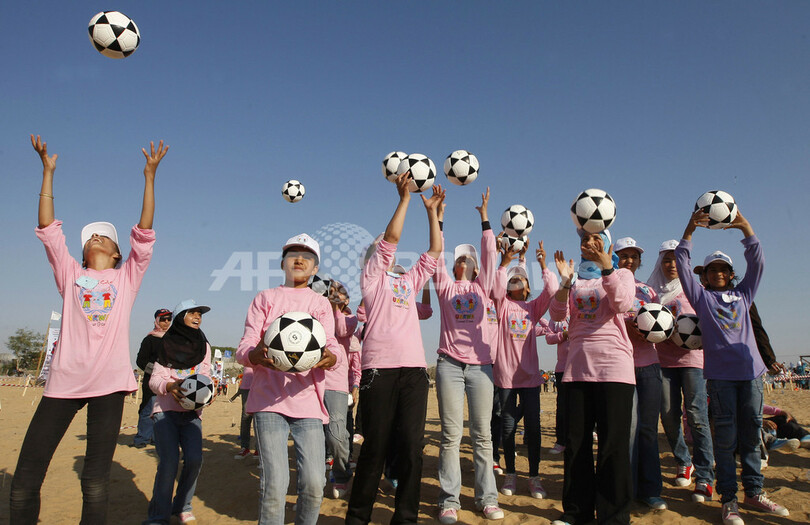 写真は、サッカーボールを放りあげる子どもたち(2011年7月14日撮影)。(c)AFP/SAID KHATIB