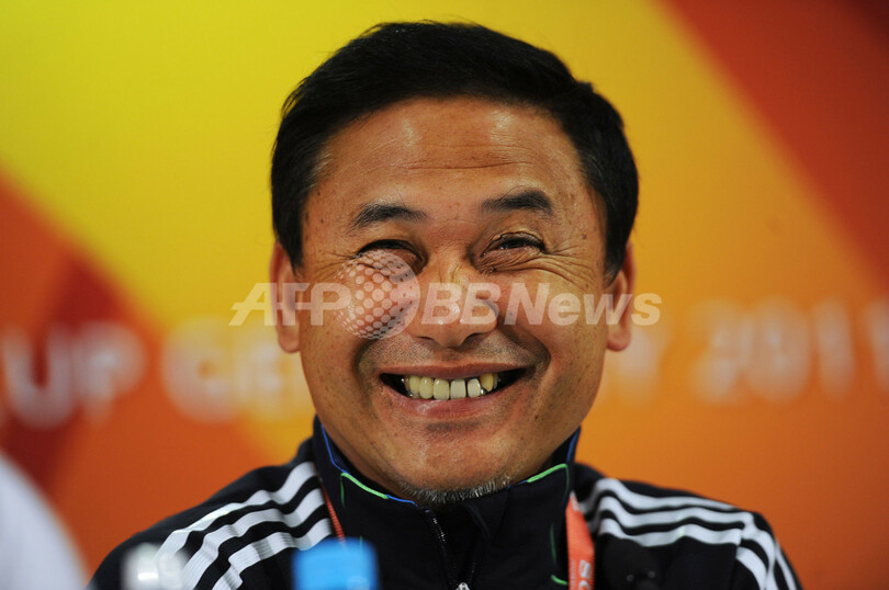 記者会見で笑顔を見せる日本の佐々木則夫監督(Norio Sasaki、2011年7月16日撮影)。(c)AFP/PATRIK STOLLARZ
