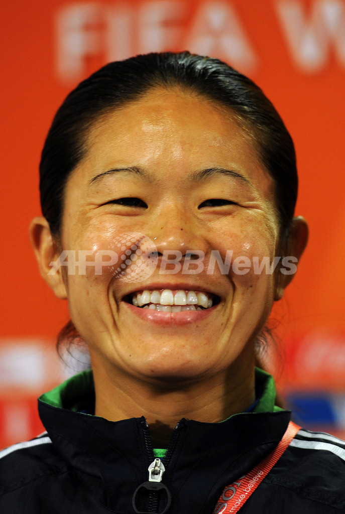 記者会見で笑顔を見せる日本の澤穂希(Homare Sawa、2011年7月16日撮影)。(c)AFP/PATRIK STOLLARZ