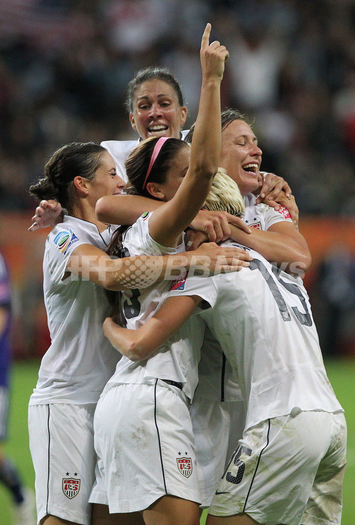 後半24分に先制点を決め、チームメイトと喜ぶ米国のアレックス・モーガン(Alex Morgan、2011年7月17日撮影)。(c)AFP/DANIEL ROLAND