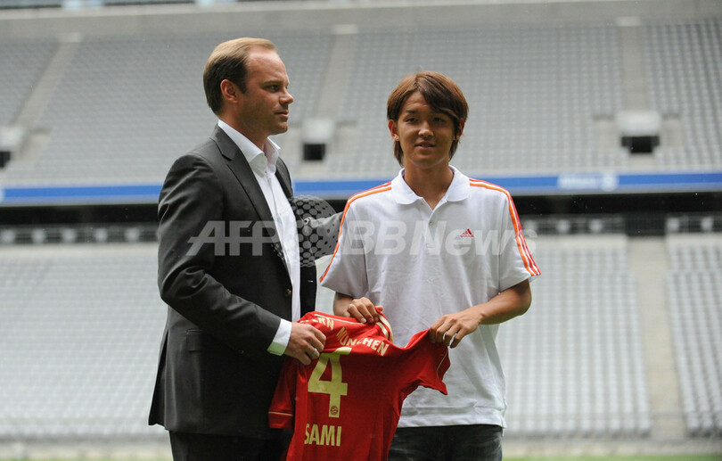 スポーツディレクターのクリスチャン・ネルリンガー(Christian Nerlinger)氏とともに本拠地アリアンツ・アレーナ・スタジアム(Allianz Arena Stadium)に姿を見せた宇佐美貴史(Takashi Usami、2011年7月18日撮影)。(c)AFP/ANDREAS GEBERT