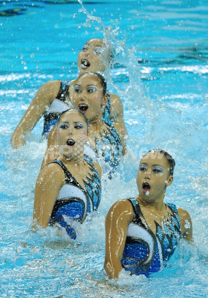 第14回世界水泳選手権(14th FINA World Championships)、シンクロナイズドスイミング、チームテクニカルルーティン(TR)決勝。演技に臨む日本の選手(2011年7月19日撮影)。(c)AFP/PETER PARKS