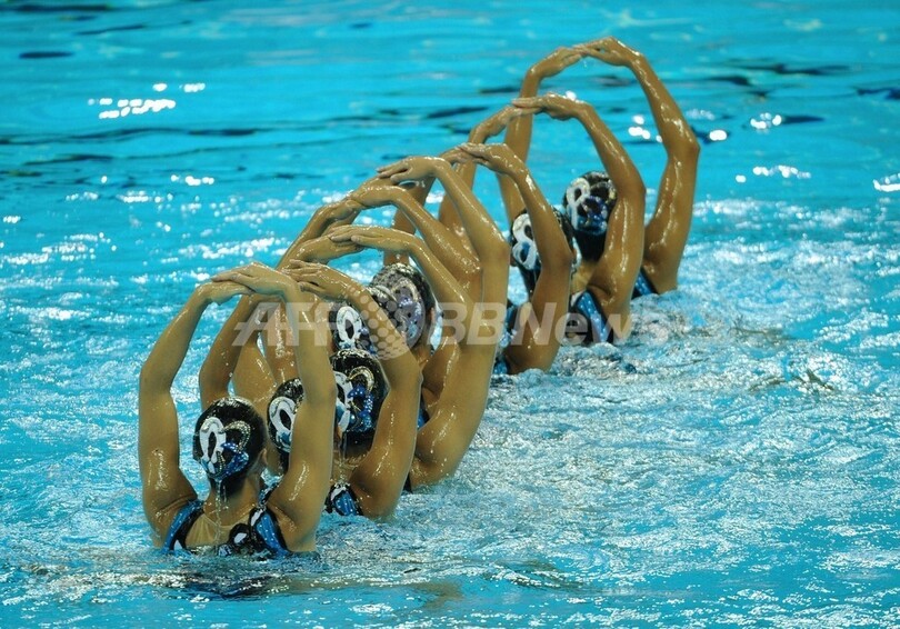 第14回世界水泳選手権(14th FINA World Championships)、シンクロナイズドスイミング、チームテクニカルルーティン(TR)決勝。演技に臨む日本の選手(2011年7月19日撮影)。(c)AFP/PETER PARKS