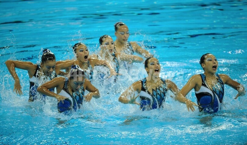 第14回世界水泳選手権(14th FINA World Championships)、シンクロナイズドスイミング、チームテクニカルルーティン(TR)決勝。演技に臨む日本の選手(2011年7月19日撮影)。(c)AFP/PETER PARKS