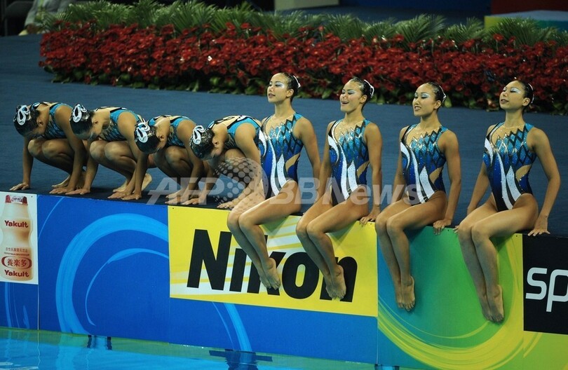第14回世界水泳選手権(14th FINA World Championships)、シンクロナイズドスイミング、チームテクニカルルーティン(TR)決勝。演技に臨む日本の選手(2011年7月19日撮影)。(c)AFP/PETER PARKS
