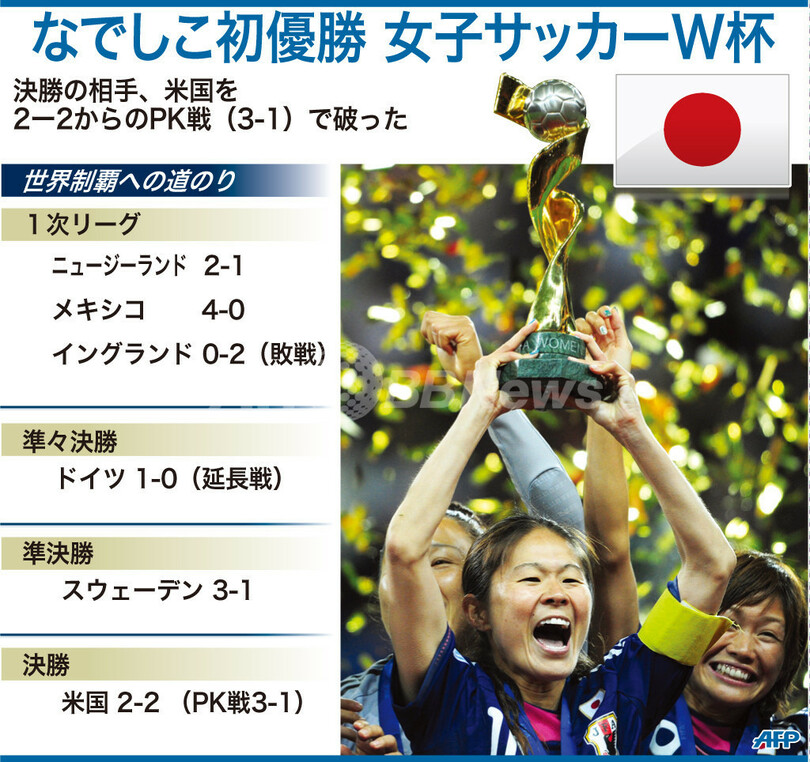 【7月19日 AFP】女子サッカーW杯ドイツ大会(FIFA Women's World Cup 2011)は17日、フランクフルト(Frankfurt)で決勝が行われ、日本は2-2の末に迎えたPK戦で米国を3-1で下し初優勝を飾った。図は、日本代表の今大会の戦績を示したもの。(c)AFP