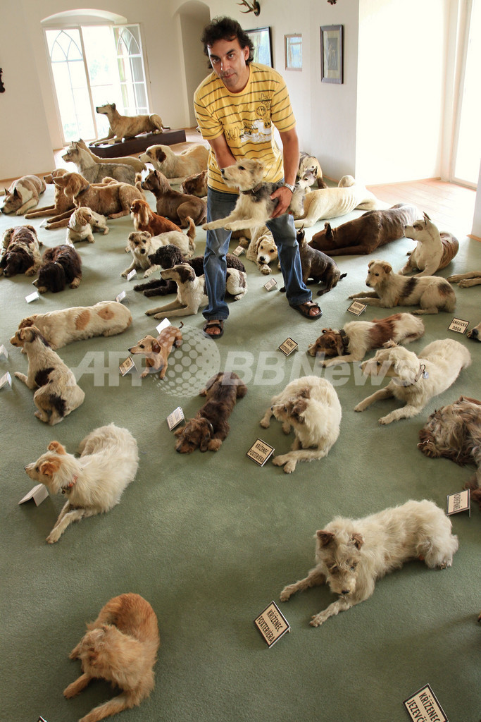 【7月20日 AFP】チェコ東部の南モラバ(South Moravia)にあるビートフ城(Bitov Castle)には、この城のかつての城主が手掛けた世界最多の犬の剥製がある。1945年、オーストリアへの国外追放を前に自殺した同城主は、数千匹の動物と約200匹の犬を所有していた。剥製にされたのは200匹の犬のうちの51匹で、そのほかの犬は城の周囲にそれぞれ埋葬され、その墓には名前を彫った小さな金属板と木製の十字架が添えられている。(c)AFP