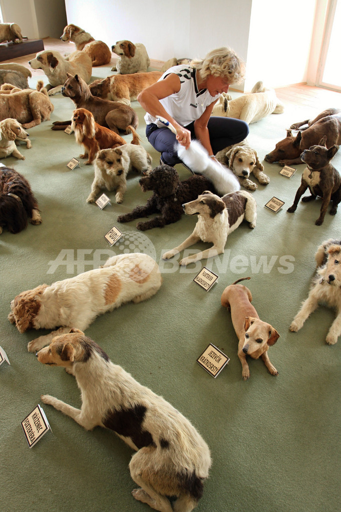 【7月20日 AFP】チェコ東部の南モラバ(South Moravia)にあるビートフ城(Bitov Castle)には、この城のかつての城主が手掛けた世界最多の犬の剥製がある。1945年、オーストリアへの国外追放を前に自殺した同城主は、数千匹の動物と約200匹の犬を所有していた。剥製にされたのは200匹の犬のうちの51匹で、そのほかの犬は城の周囲にそれぞれ埋葬され、その墓には名前を彫った小さな金属板と木製の十字架が添えられている。(c)AFP