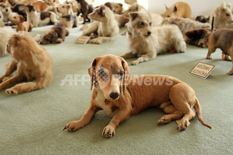 【7月20日 AFP】チェコ東部の南モラバ(South Moravia)にあるビートフ城(Bitov Castle)には、この城のかつての城主が手掛けた世界最多の犬の剥製がある。1945年、オーストリアへの国外追放を前に自殺した同城主は、数千匹の動物と約200匹の犬を所有していた。剥製にされたのは200匹の犬のうちの51匹で、そのほかの犬は城の周囲にそれぞれ埋葬され、その墓には名前を彫った小さな金属板と木製の十字架が添えられている。(c)AFP
