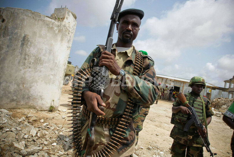 写真はソマリアの首都モガディシオ(Mogadishu)に暫定政府が新たに建設した国内避難民キャンプ前で、アフリカ連合ソマリア・ミッション(African Union Mission to Somalia、AMISOM)の兵士と共に警戒にあたる暫定政府軍兵士(2011年7月20日撮影)。(c)AFP/AU-UN IST/STUART PRICE