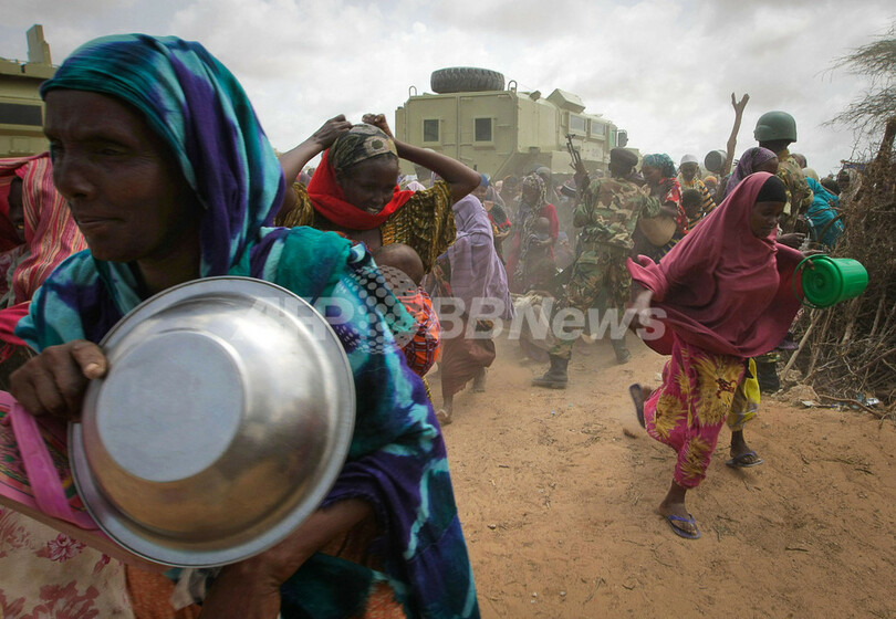 写真はソマリアの首都モガディシオ(Mogadishu)に暫定政府が新たに建設した国内避難民キャンプで、食糧配給に殺到する女性たち(2011年7月20日撮影)。(c)AFP/AU-UN IST/STUART PRICE
