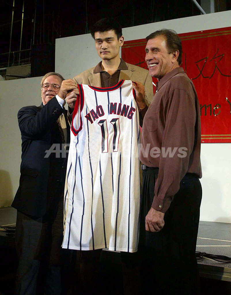 2002年のNBAドラフトでヒューストン・ロケッツから全体1巡目1位指名され、記者会見に臨む姚明(2001年2月18日撮影)。(c)AFP/James NIELSEN