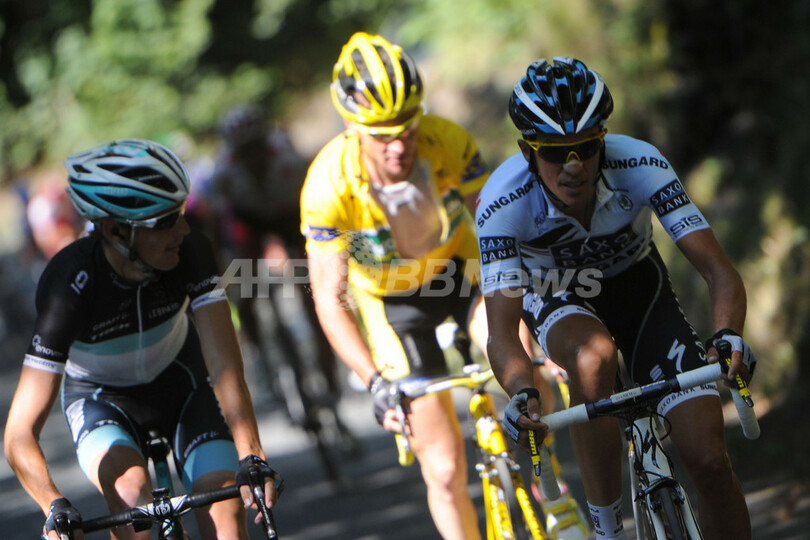 しかしながらヴォクレールは、総合2位につけるBMCレーシングチーム(BMC Racing Team)のカデル・エヴァンス(Cadel Evans、オーストラリア)、レオパード・トレック(Leopard Trek)所属の同3位フランク・シュレク(Frank Schleck、ルクセンブルク)と同4位アンディ・シュレク(Andy Schleck、ルクセンブルク)、そして、サクソバンク・サンガード(Saxo Bank-Sungard)のアルベルト・コンタドール(Alberto Contador、スペイン)らが形成していた集団から遅れをとり、合計タイムで27秒をロスしている。(c)AFP