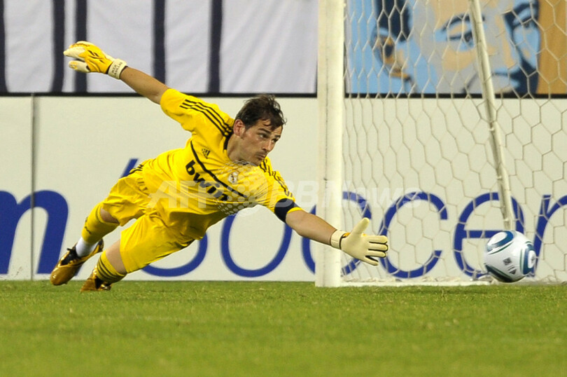 シュートをセーブするレアル・マドリードのGKイケル・カシージャス(Iker Casillas、2011年7月23日撮影)。(c)AFP/Getty Images/Drew Hallowell