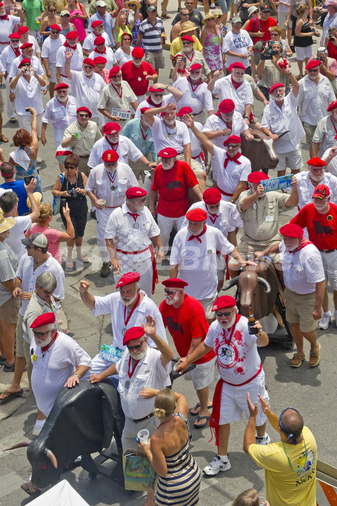 【7月24日 AFP】米フロリダ(Florida)州キーウエスト(Key West)で23日、米作家アーネスト・ヘミングウェイ(Ernest Hemingway)に敬意を表した「牛追い祭り」が開かれ、ヘミングウェイの格好に扮したそっくりさんたちが、牛の像にまたがって街を練り歩いた。