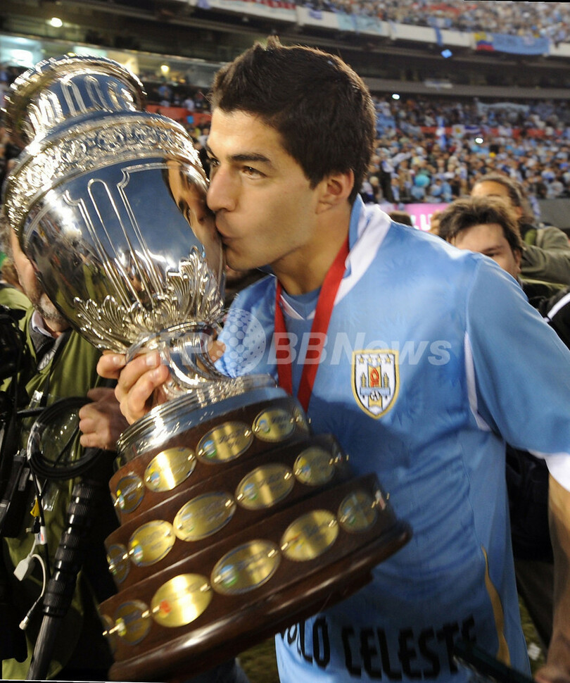 優勝トロフィーにキスをして喜ぶウルグアイのルイス・スアレス(Luis Suarez、2011年7月24日撮影)。(c)AFP/