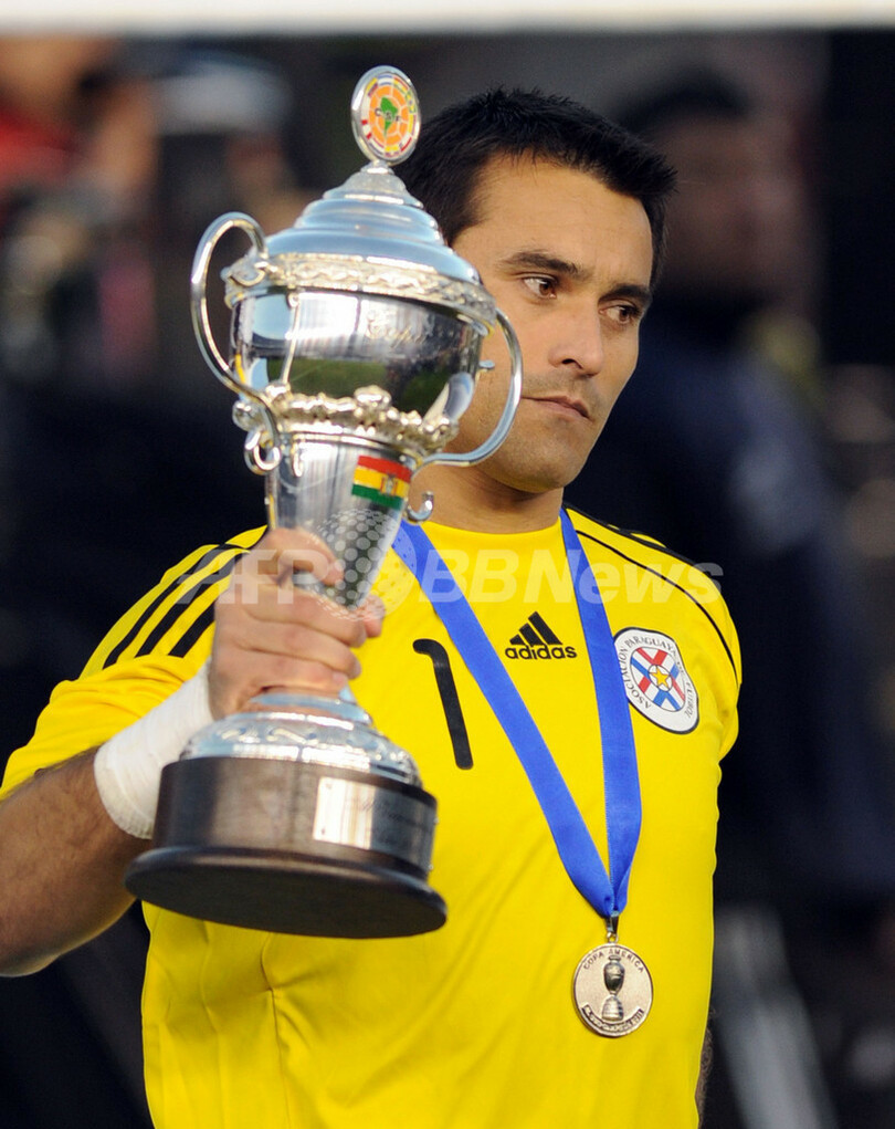 準優勝のトロフィーを手にするパラグアイのGK フスト・ビジャール(Justo Villar、2011年7月24日撮影)。(c)AFP/JUAN MABROMATA
