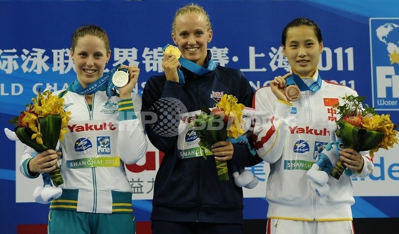 56秒94でオーストラリアのアリシア・クーツ(Alicia Coutts)が銀メダル、57秒06で中国の劉子歌(Liu Zige)が銅メダルを獲得した。(c)AFP