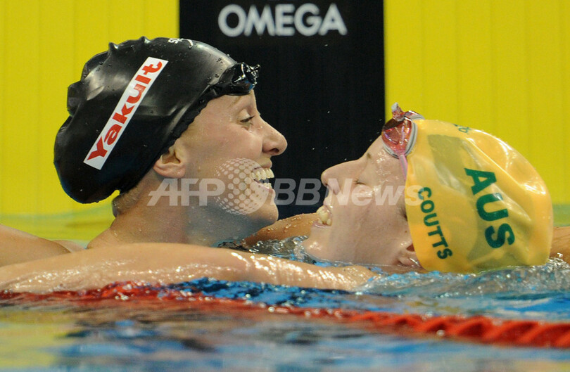 56秒94でオーストラリアのアリシア・クーツ(Alicia Coutts)が銀メダル、57秒06で中国の劉子歌(Liu Zige)が銅メダルを獲得した。(c)AFP