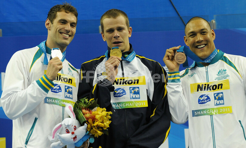 23秒28でオーストラリアのマシュー・ターゲット(Matthew Targett)が銀メダル、23秒35でオーストラリアのジェフ・ヒューギル(Geoff Huegill)が銅メダルを獲得した。(c)AFP