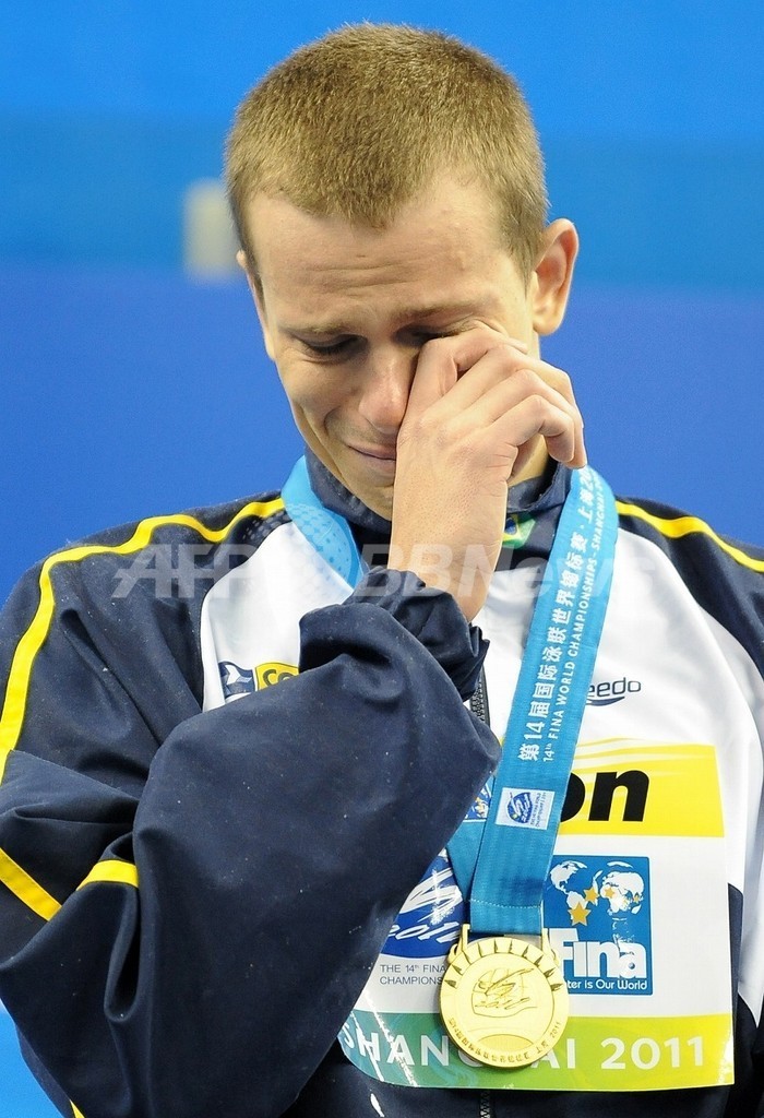 23秒28でオーストラリアのマシュー・ターゲット(Matthew Targett)が銀メダル、23秒35でオーストラリアのジェフ・ヒューギル(Geoff Huegill)が銅メダルを獲得した。(c)AFP