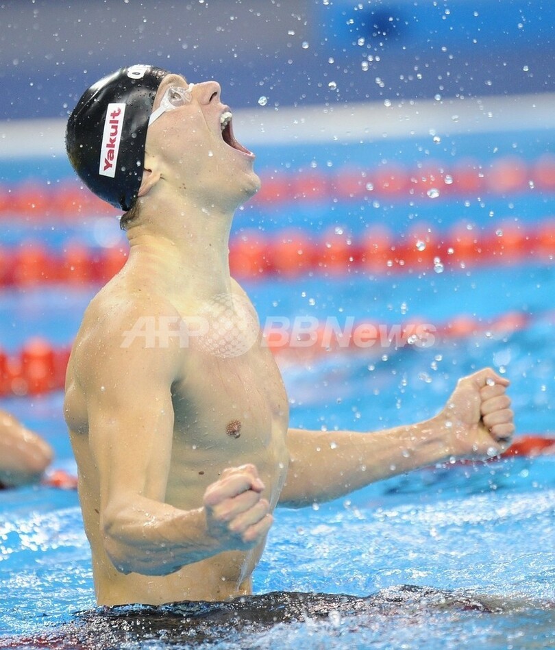 23秒28でオーストラリアのマシュー・ターゲット(Matthew Targett)が銀メダル、23秒35でオーストラリアのジェフ・ヒューギル(Geoff Huegill)が銅メダルを獲得した。(c)AFP