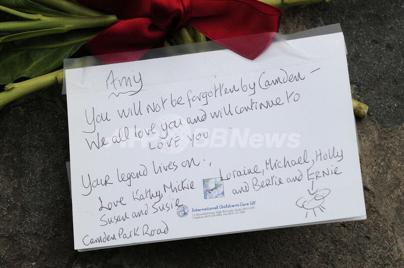写真は、遺体が発見されたワインハウスさんの自宅前に捧げられたメッセージ(2011年7月23日撮影)。(c)AFP/CARL COURT