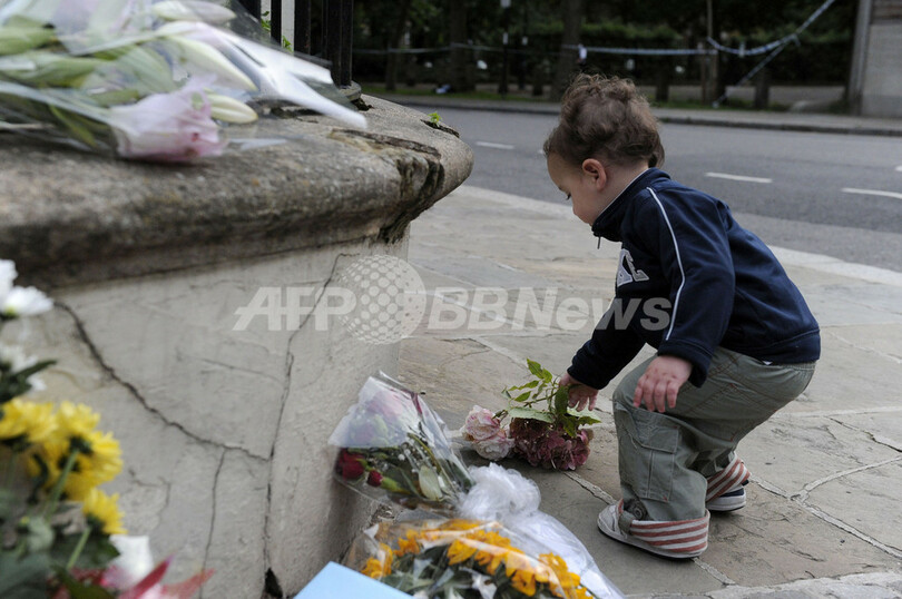 写真は、遺体が発見されたワインハウスさんの自宅前に花束を捧げる少年(2011年7月23日撮影)。(c)AFP/CARL COURT