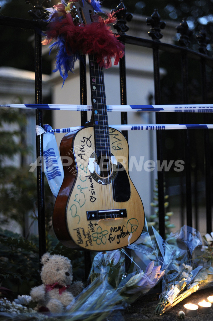 写真は、遺体が発見されたワインハウスさんの自宅前に捧げられたギター(2011年7月23日撮影)。(c)AFP/CARL COURT