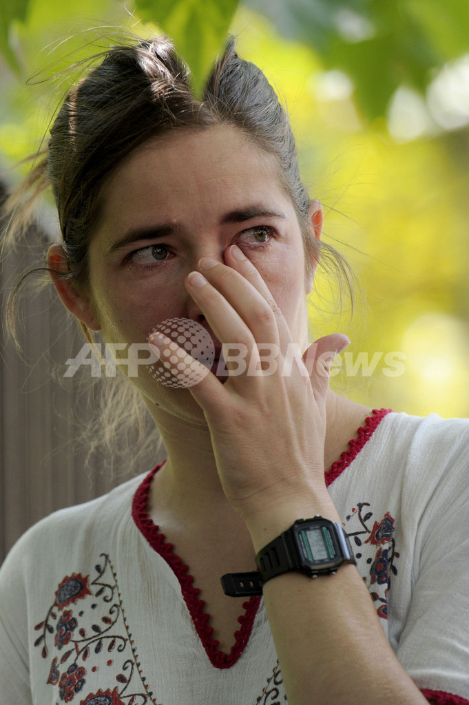 写真は、遺体が発見されたワインハウスさんの自宅前で涙を流す女性(2011年7月24日撮影)。(c)AFP/CARL COURT