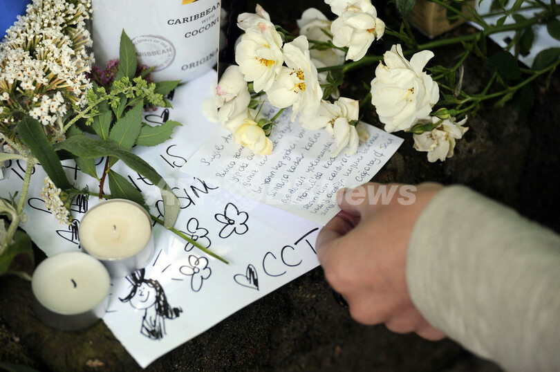 写真は、遺体が発見されたワインハウスさんの自宅前に捧げられた花束やメッセージ(2011年7月24日撮影)。(c)AFP/CARL COURT