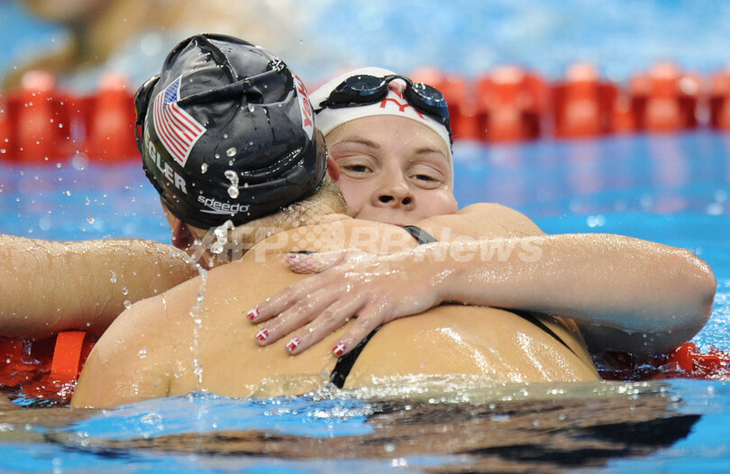 レース終了後にケイト・ジーグラー(Kate Ziegler、手前)と健闘を称えあうロッテ・フリース(Lotte Friis、2011年7月26日撮影)。(c)AFP/FRANCOIS XAVIER MARIT