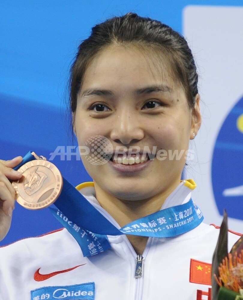 表彰台で銅メダルを手にポーズをとる季丽萍(Ji Liping、2011年7月26日撮影)。(c)AFP/PETER PARKS