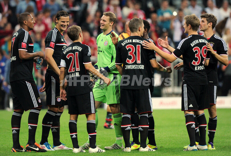 試合に勝利し喜ぶバイエルン・ミュンヘンの選手(2011年7月26日撮影)。(c)AFP/CHRISTOF STACHE