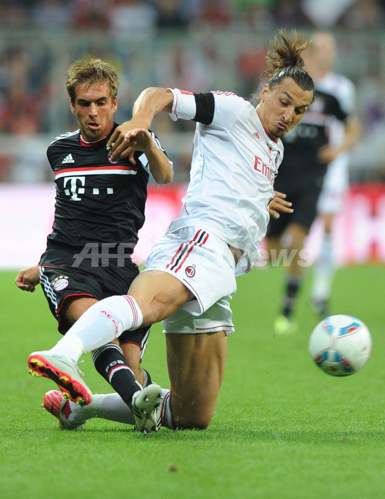バイエルン・ミュンヘンのフィリップ・ラーム(Philipp Lahm、左)と競るACミランのズラタン・イブラヒモビッチ(Zlatan Ibrahimovic、2011年7月26日撮影)。(c)AFP/CHRISTOF STACHE