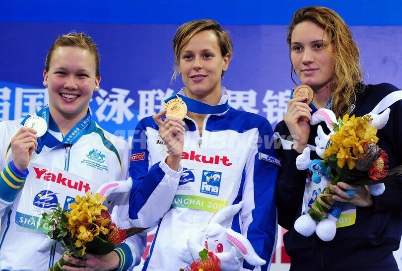 表彰台でメダルを手にポーズをとる(左から)カイリー・パーマー(Kylie Palmer)、フェデリカ・ペレグリニ(Federica Pellegrini)、カミーユ・ミュファ(Camille Muffat、2011年7月27日撮影)(c)AFP/MARK RALSTON