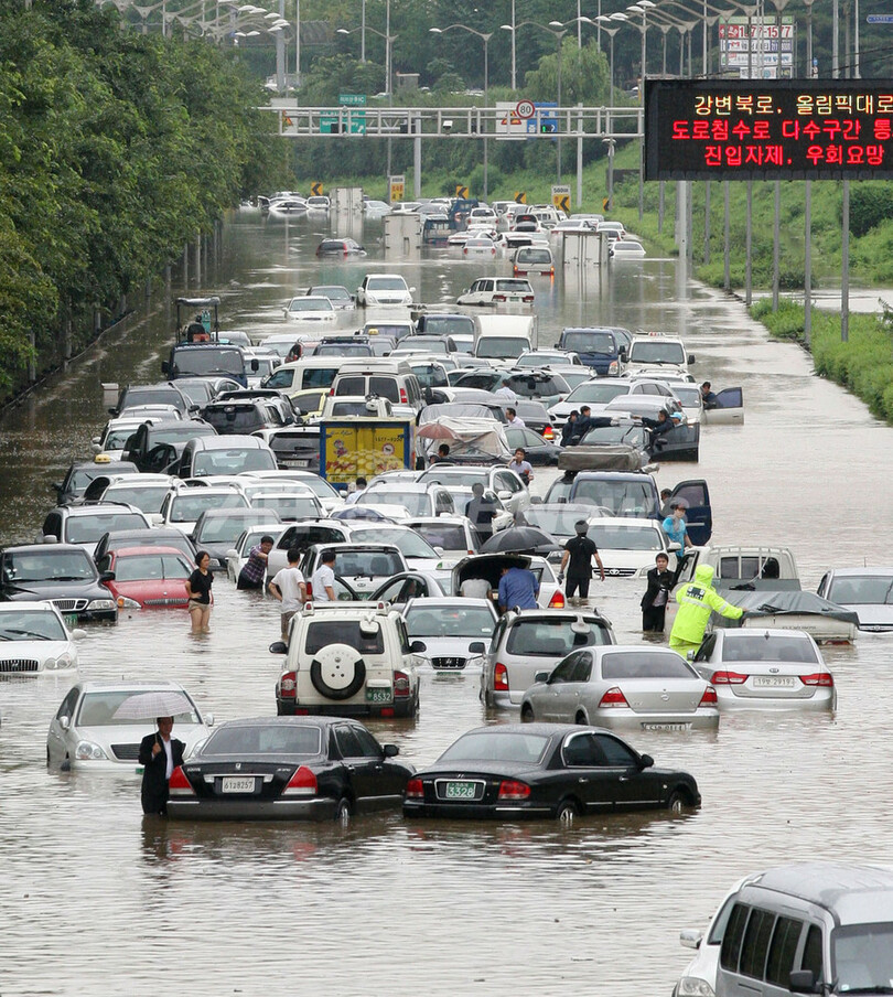 ソウル(Seoul)東方の春川(Chuncheon)では27日早朝に土砂崩れが発生して13人が死亡。40時間に433.5ミリの集中豪雨があったソウルでも同日、南部で土砂崩れがあり、少なくとも17人が死亡した。洪水と土砂崩れは幹線道路37本を寸断し、ソウルでは700戸以上が浸水した。土砂崩れ現場では、軍も投入された捜索活動が続けられている。