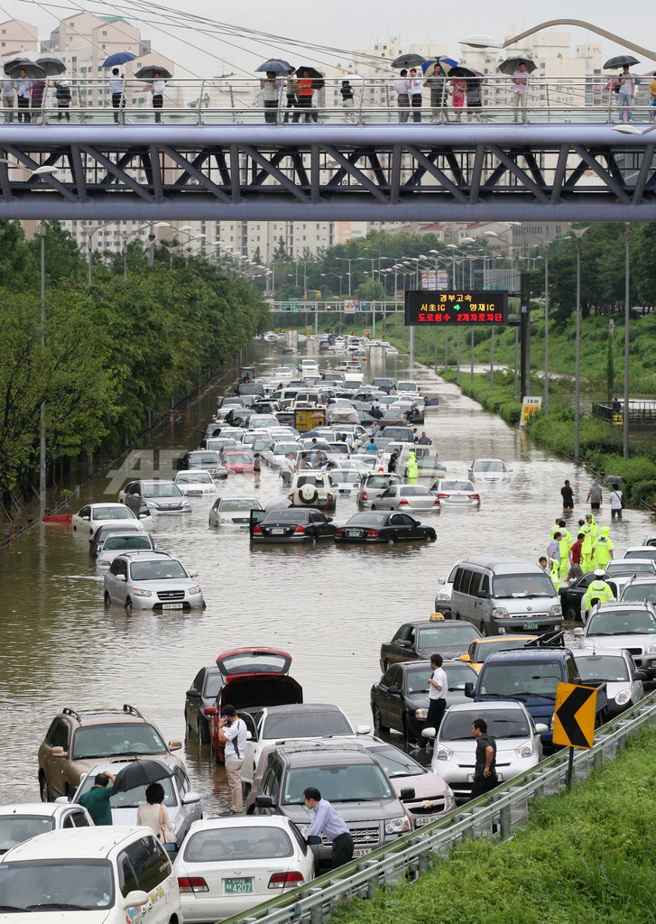 ソウル(Seoul)東方の春川(Chuncheon)では27日早朝に土砂崩れが発生して13人が死亡。40時間に433.5ミリの集中豪雨があったソウルでも同日、南部で土砂崩れがあり、少なくとも17人が死亡した。洪水と土砂崩れは幹線道路37本を寸断し、ソウルでは700戸以上が浸水した。土砂崩れ現場では、軍も投入された捜索活動が続けられている。