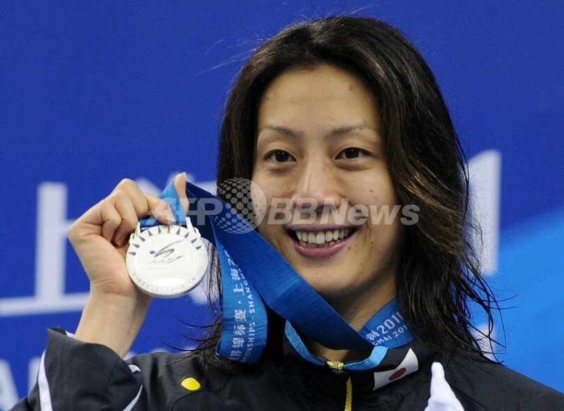 表彰台で銀メダルを手にポーズをとる寺川綾(Aya Terakawa、2011年7月28日撮影)。(c)AFP/PETER PARKS