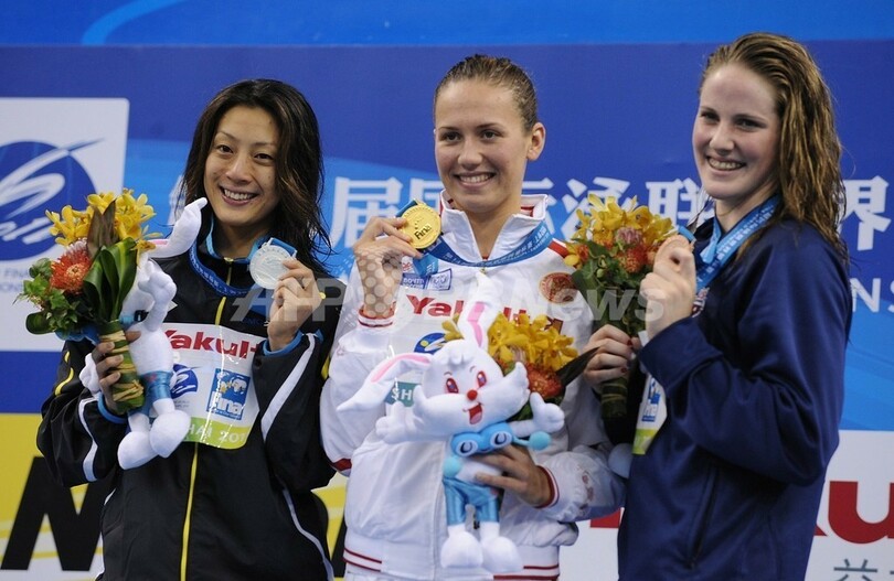 表彰台でメダルを手にポーズをとる(左から)寺川綾(Aya Terakawa)、アナスタシア・ズエワ(Anastasia Zueva)、メリッサ・フランクリン(Melissa Franklin、2011年7月28日撮影)。(c)AFP/PETER PARKS