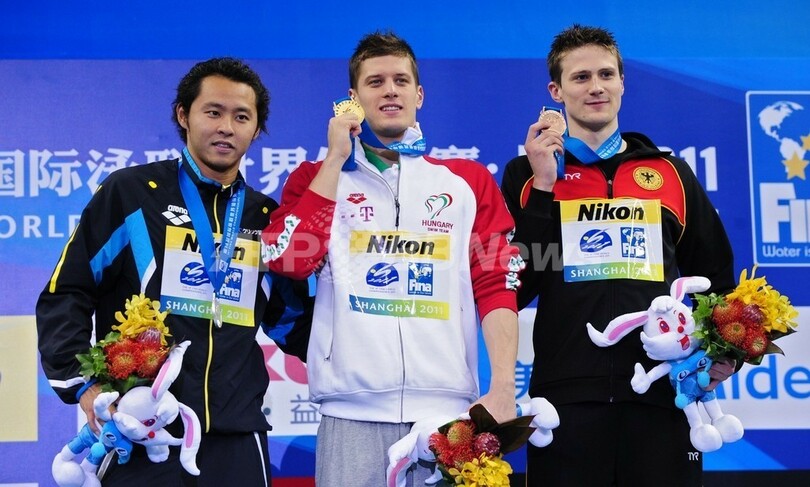 表彰式に臨む(左から)銀メダルの北島康介、金メダルのダニエル・ギュルタ、銅メダルのクリスティアン・フォン・レーン(2011年7月29日撮影)。(c)AFP/MARK RALSTON