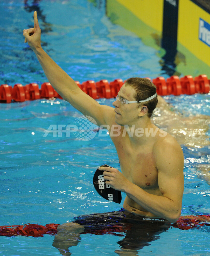 優勝を飾り、人差し指を立てて喜ぶセザル・シエロ・フィーリョ(2011年7月30日撮影)。(c)AFP/MARK RALSTON