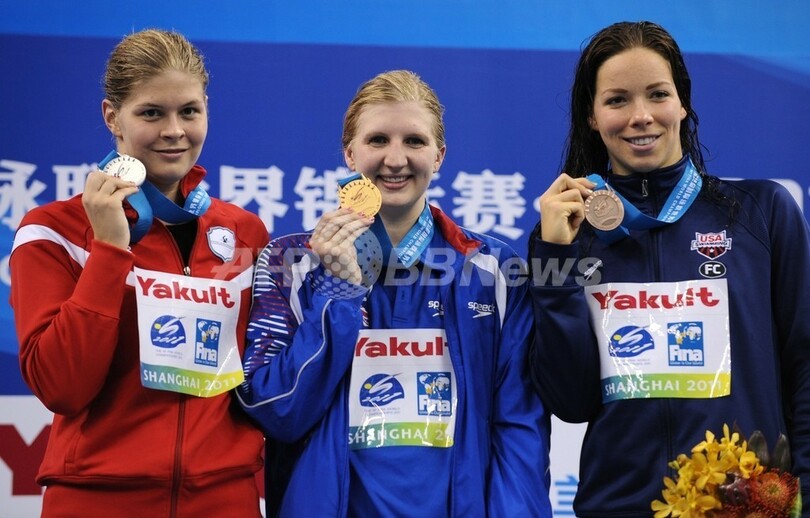 表彰式に臨む(左から)銀メダルのロッテ・フリース、金メダルのレベッカ・アドリントン、銅メダルのケイト・ジーグラー(2011年7月30日撮影)。(c)AFP/PETER PARKS